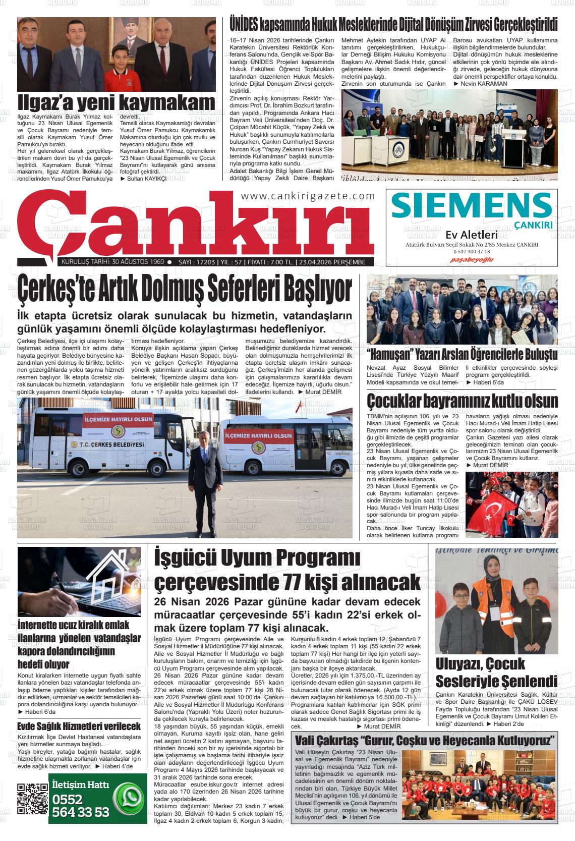Çankırı Yerel Gazeteleri 23 Nisan 2026, Perşembe Günü Manşeti