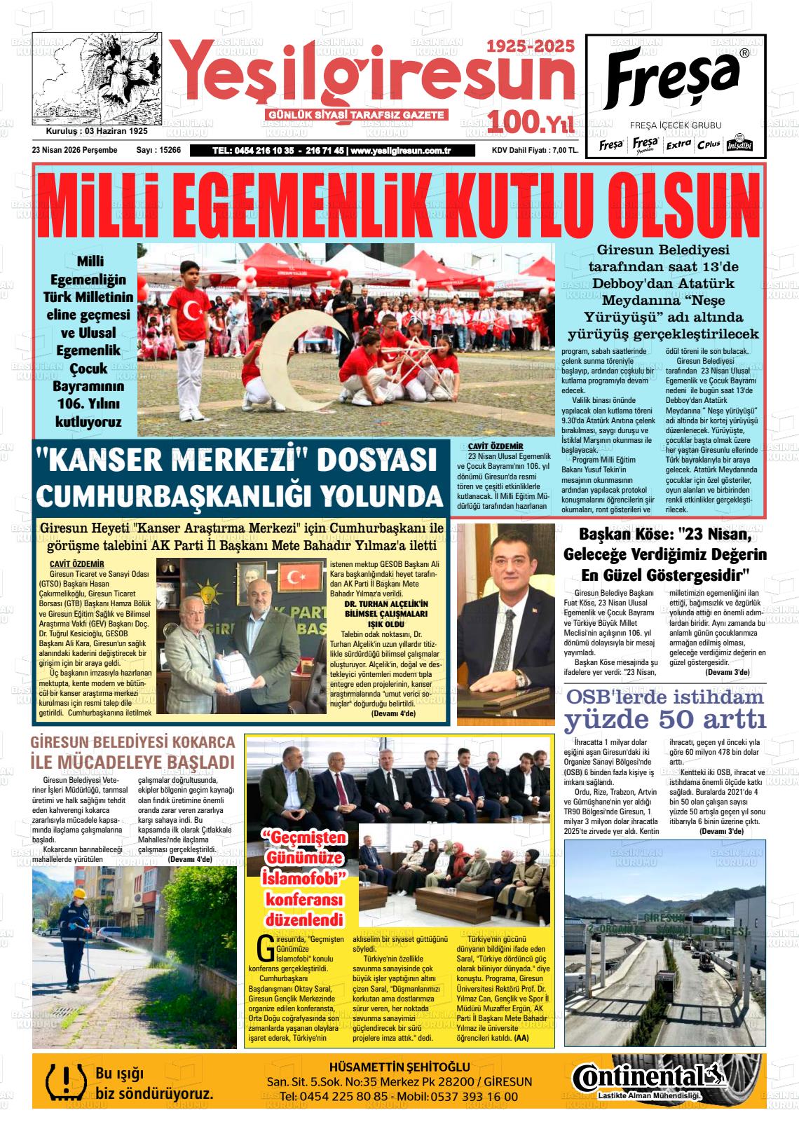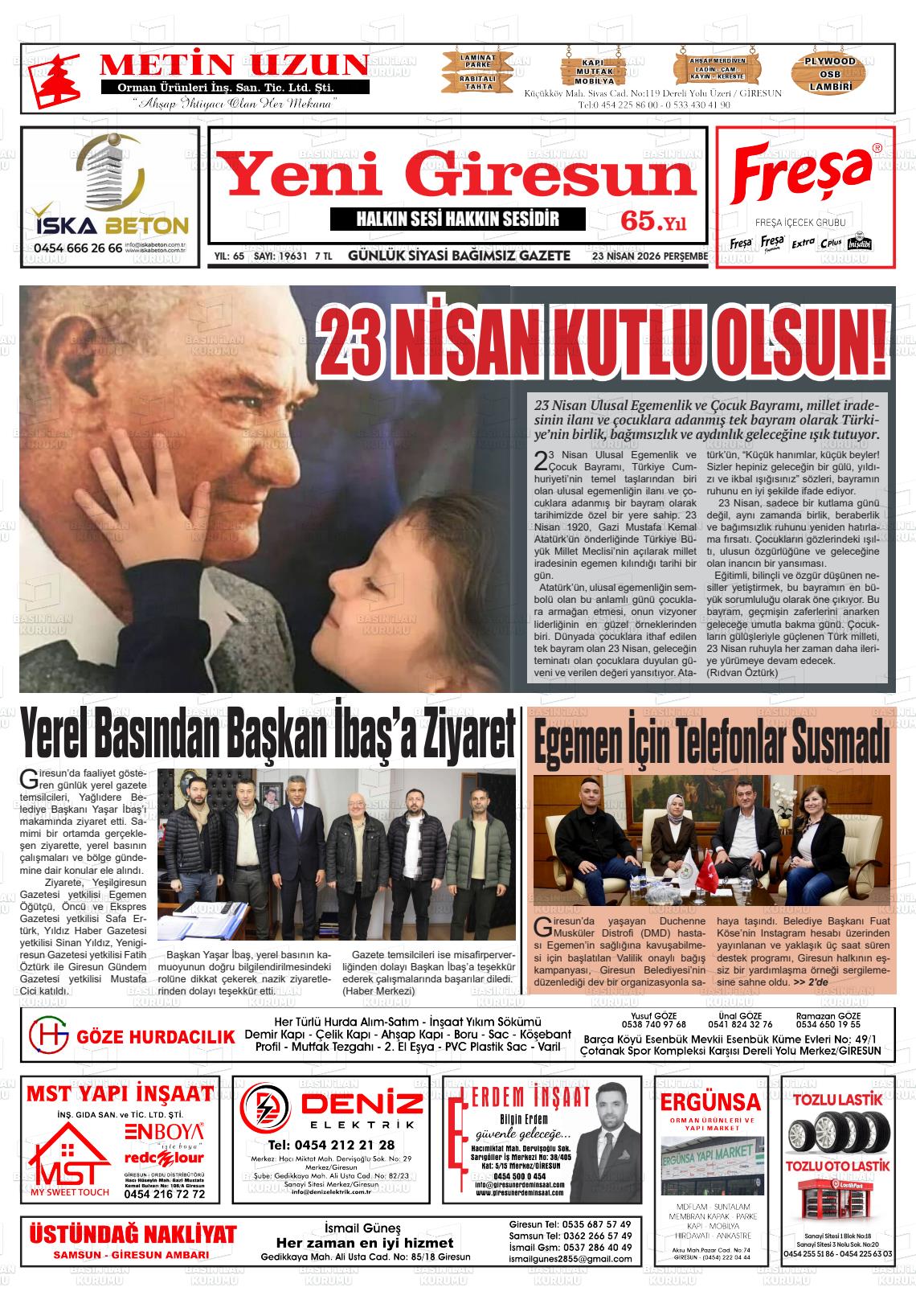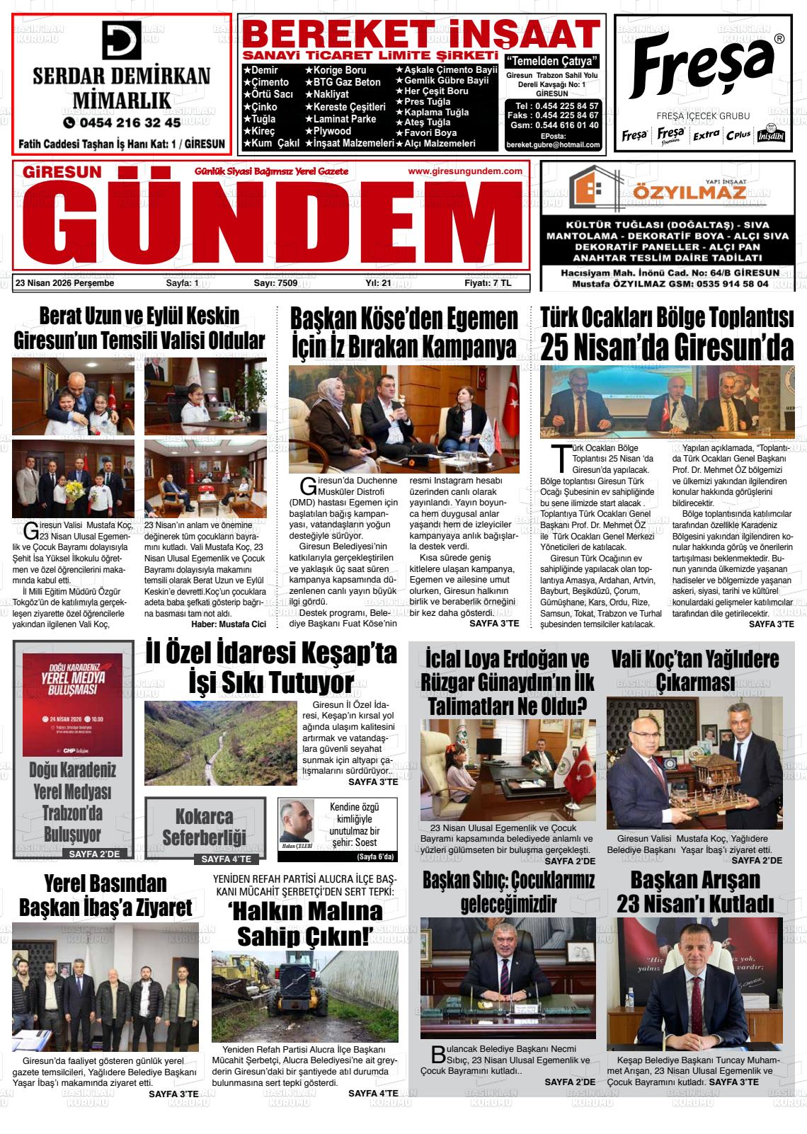 Gİresun Yerel Gazeteleri 23 Nisan 2026, Perşembe Günü Manşeti