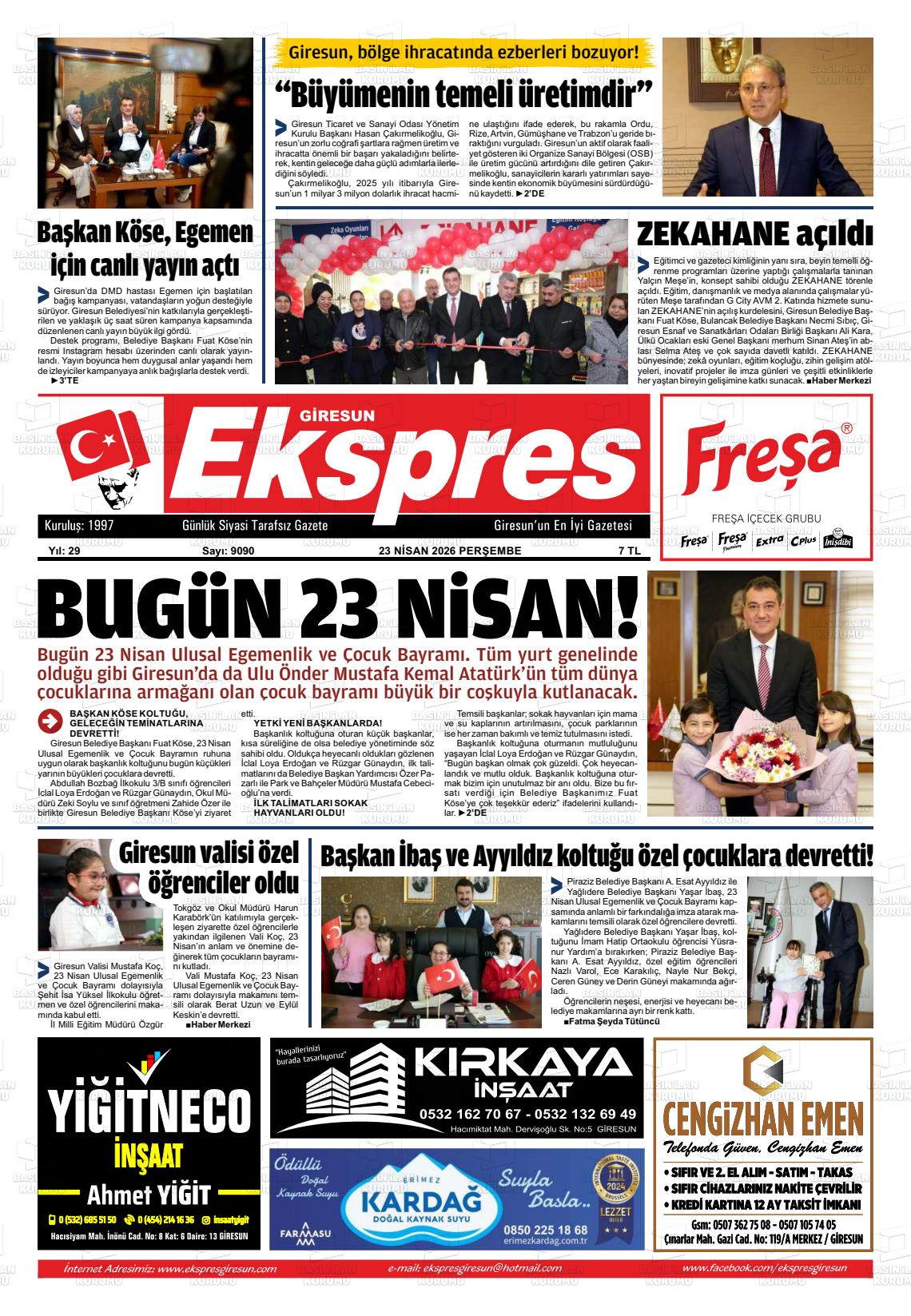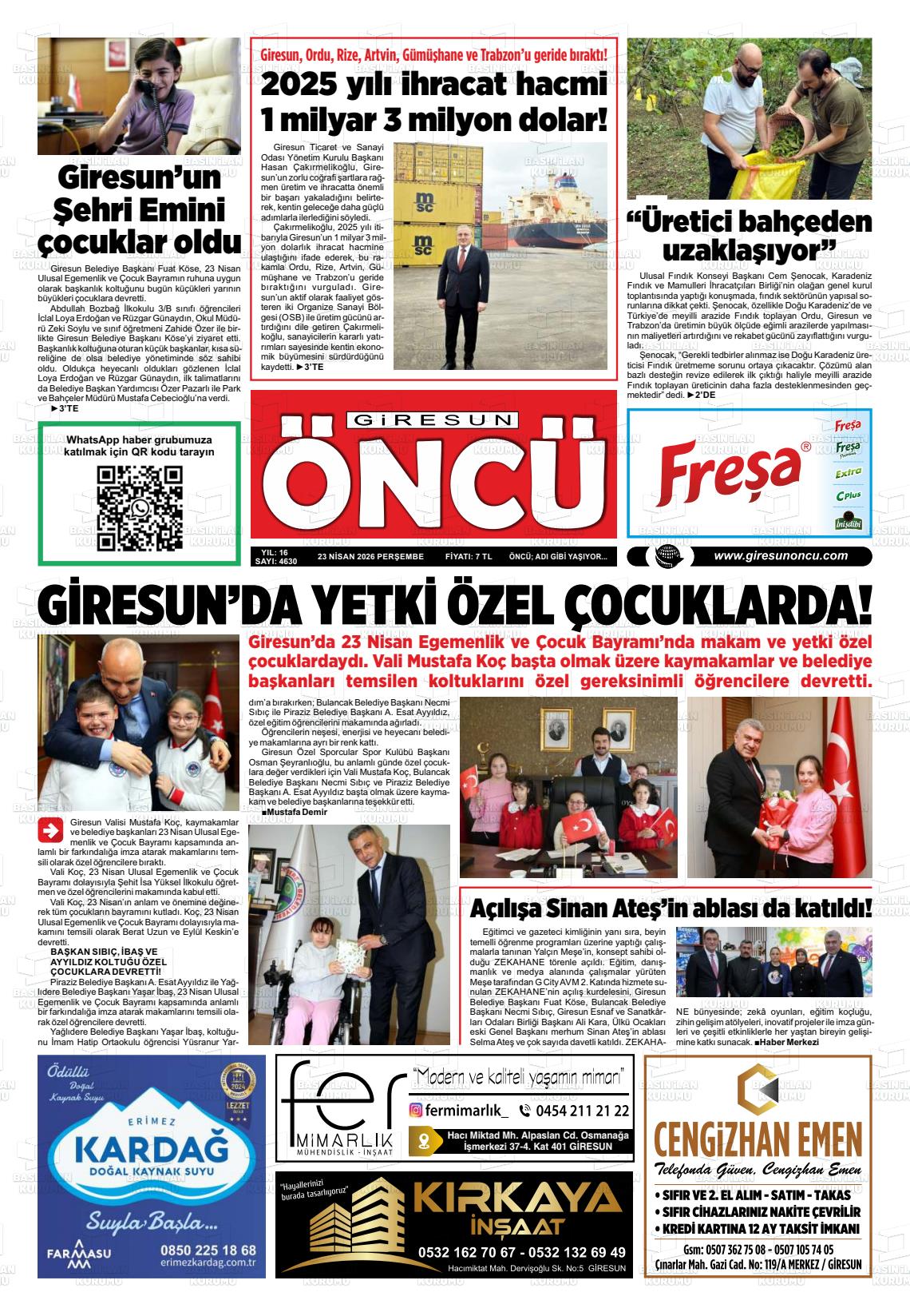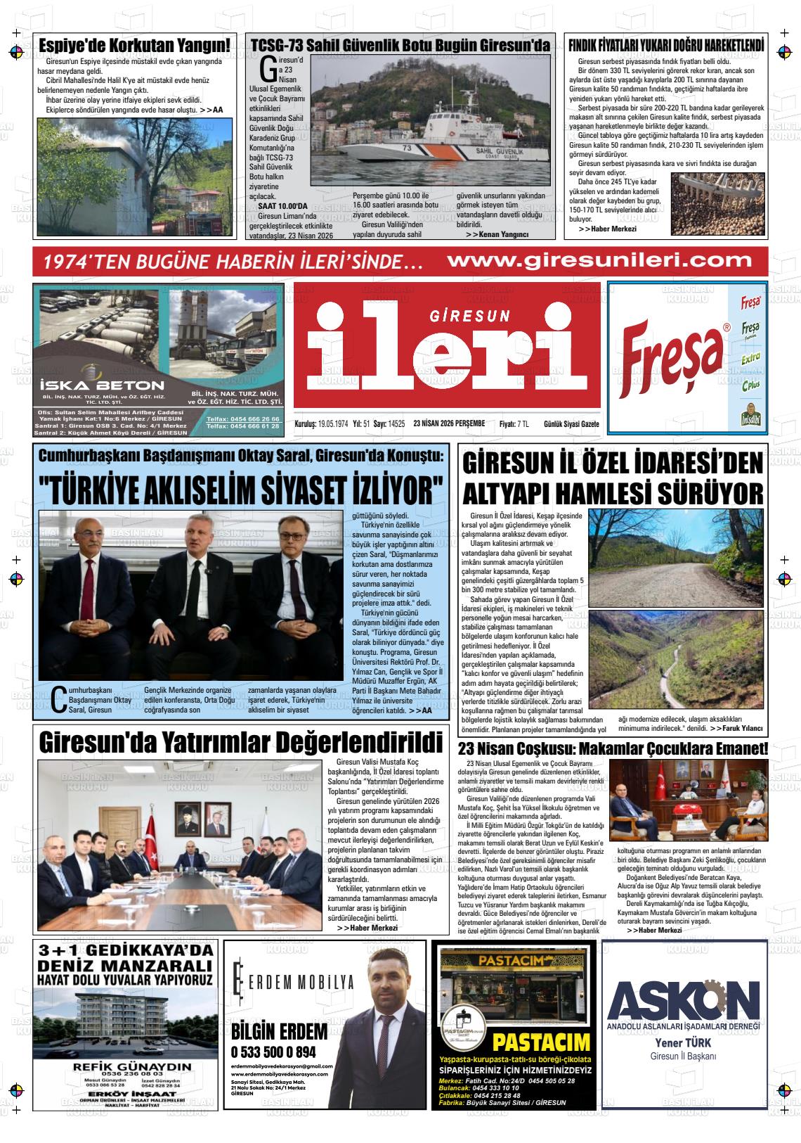 Gİresun Yerel Gazeteleri 23 Nisan 2026, Perşembe Günü Manşeti