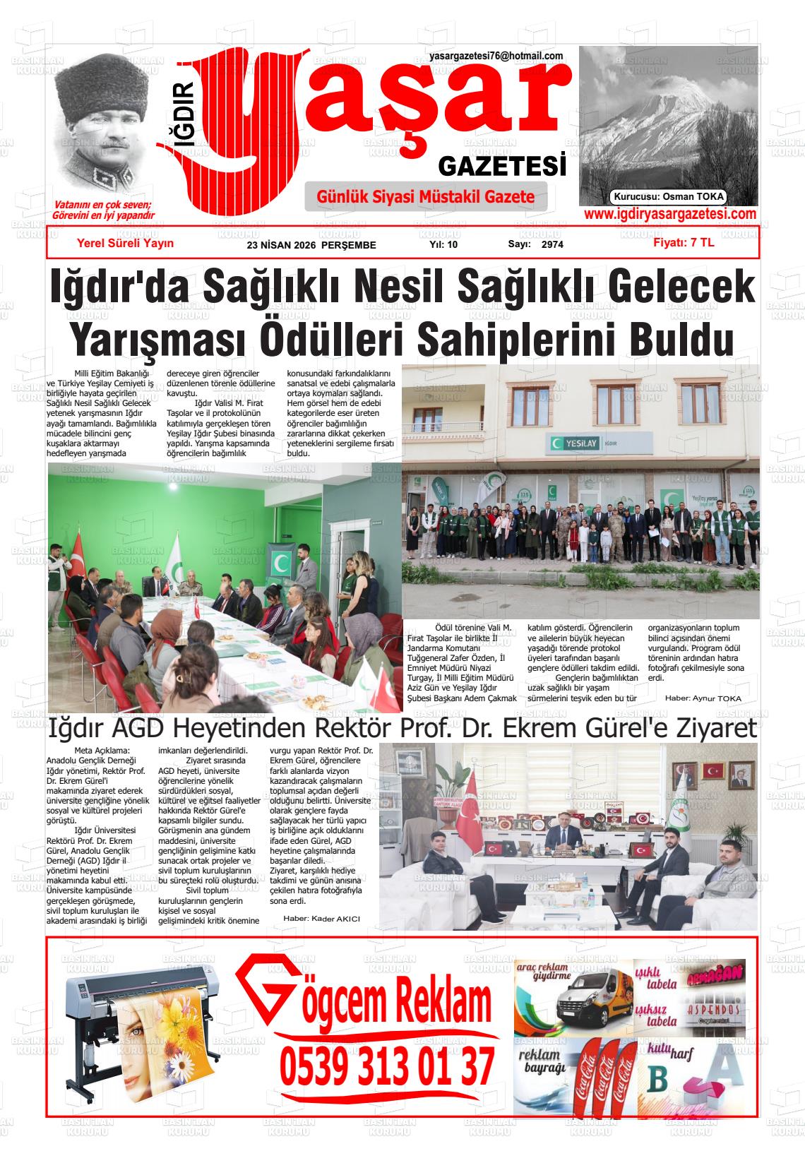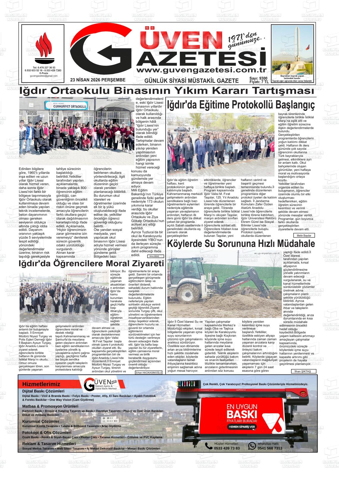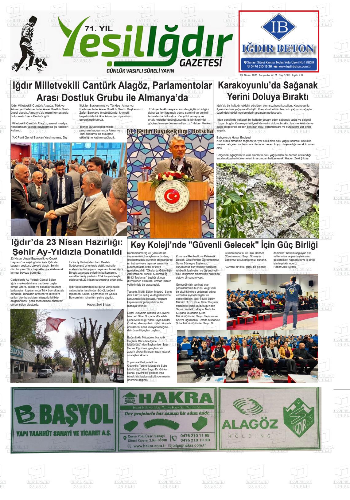 Iğdır Yerel Gazeteleri 23 Nisan 2026, Perşembe Günü Manşeti