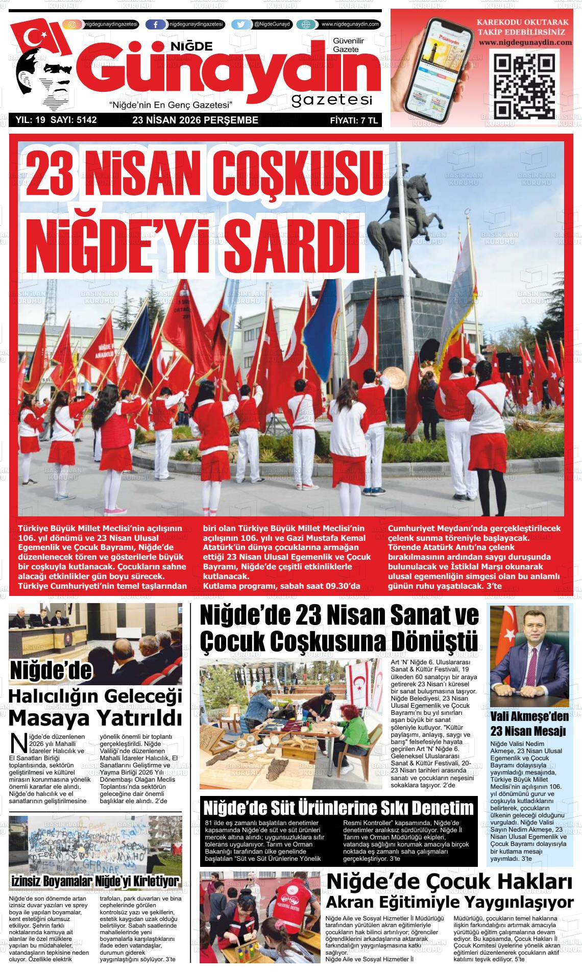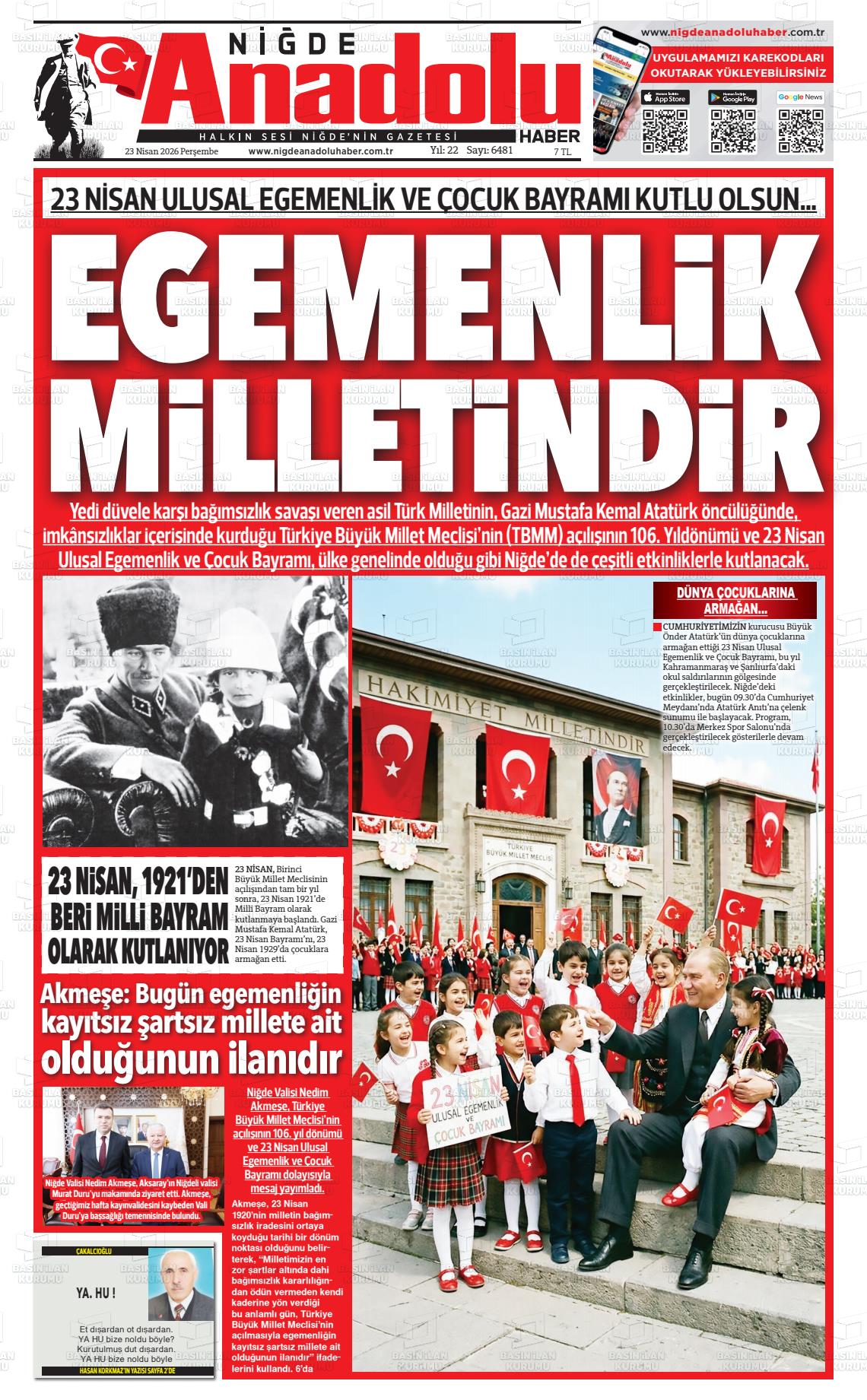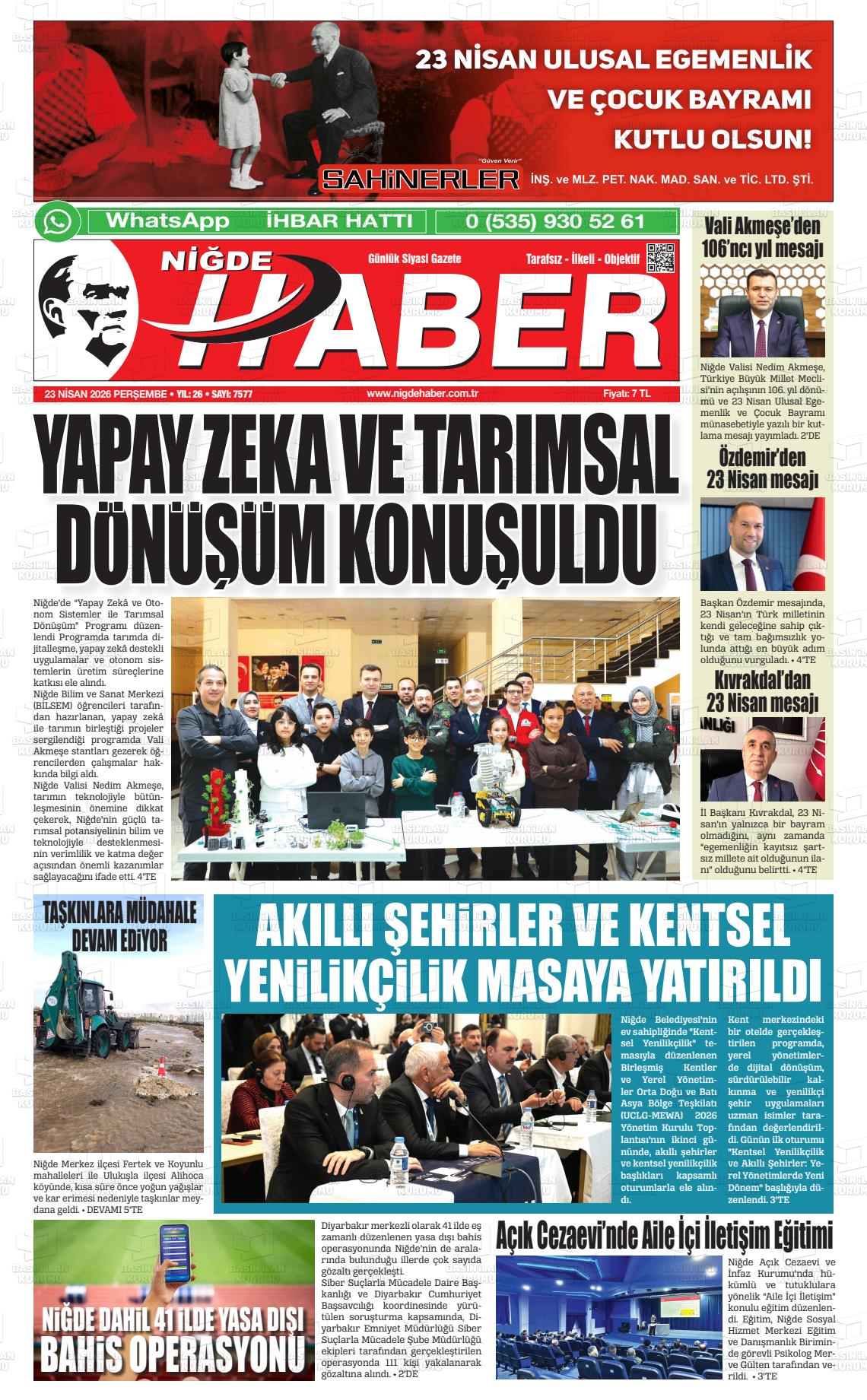 Nİğde Yerel Gazeteleri 23 Nisan 2026, Perşembe Günü Manşeti